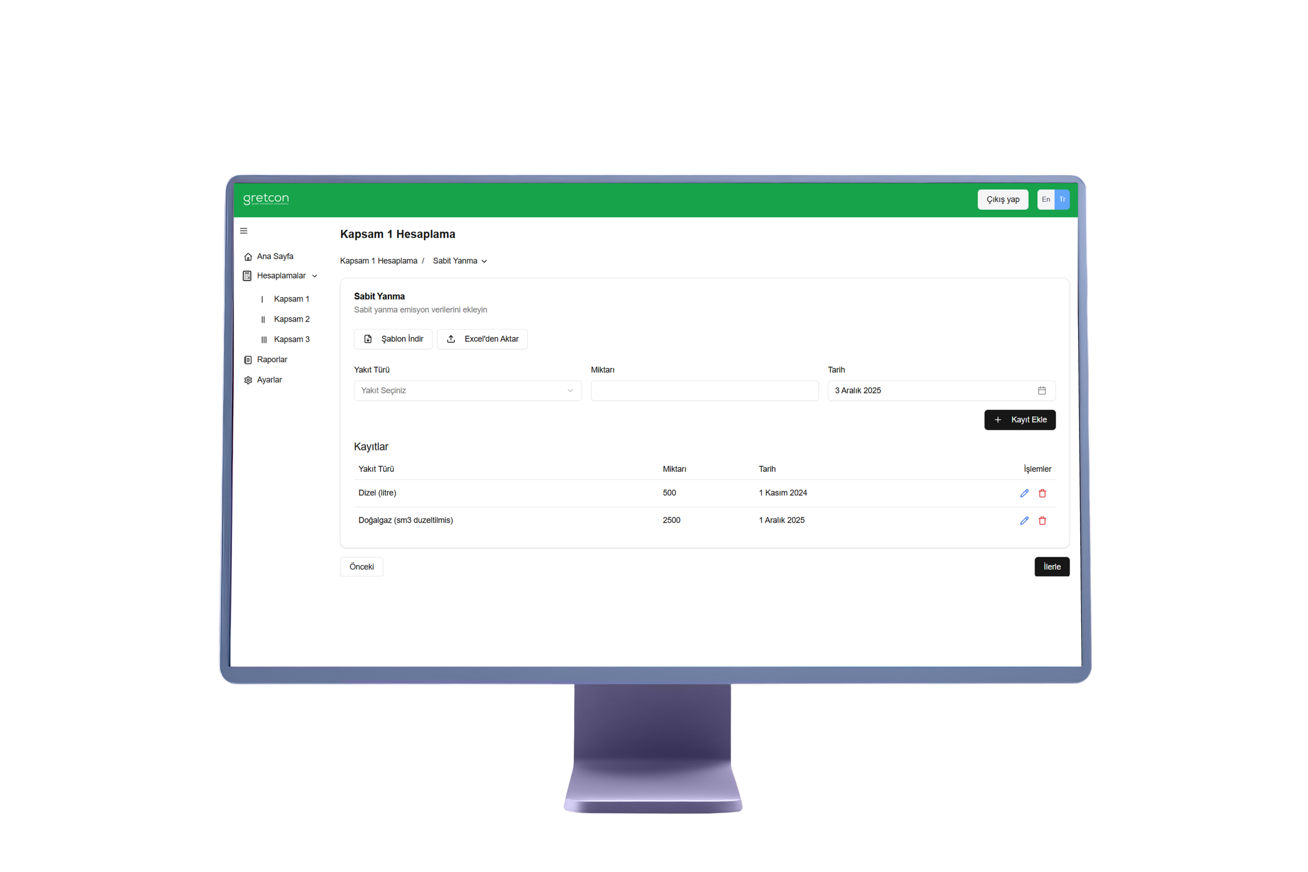 Tüm emisyon kategorilerini tek bir panel üzerinden yönetebilir; yakıt tüketimi, elektrik kullanımı, tedarik zinciri aktiviteleri, lojistik, atık yönetimi, satın alınan hizmetler ve daha birçok veri kaynağını kolayca sisteme işleyebilirsiniz.